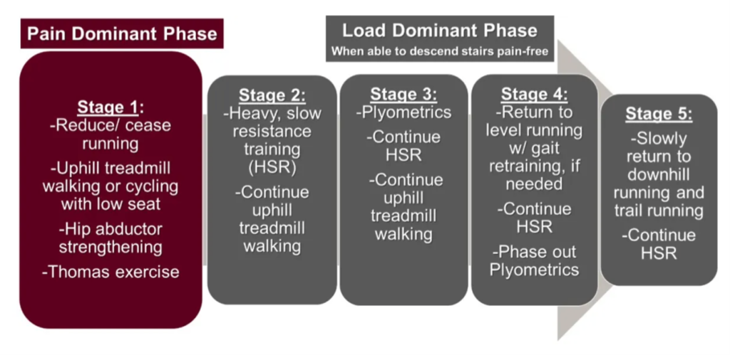 During this phase, load management is critical to reducing pain and irritation. Downhill loading and high-frequency stepping can be irritable; as such, the goal is to reduce the loading activities that are above the capacity of the tissue and cause irritation while maintaining as much loading as possible. Why? Loading is essential in pain processing, and it improves tissue quality.