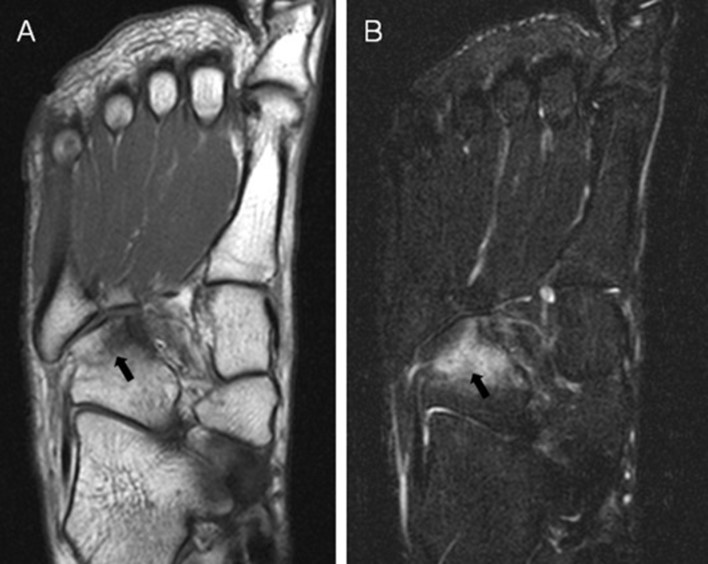 MRI image of increased signal (white areas) on the cuboid bone, which indicates a stress fracture. Contributed by Asia Pacific Journal of Sports Medicine.