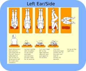After getting to know you, your Physiotherapist will ask a series of questions about when your symptoms started, what triggers your symptoms, and how long your symptoms last. From there, the Physiotherapist will do a series of visual, balance, and vestibular tests to determine your best treatment. The testing aims to trigger your symptoms so your Physiotherapist can better determine which semi-circular is affected. With a confirmed BPPV diagnosis, a manoeuvre called “Epley’s” (as seen in Figure 2) will help reposition the otoconia to its correct location. This manoeuvre will be performed 1-3 times in the clinic, and then you may be able to do a modified version at home until your symptoms have subsided for 24 hours. Your Physiotherapist will follow up with you in 2-3 days to re-perform the manoeuvre as necessary.